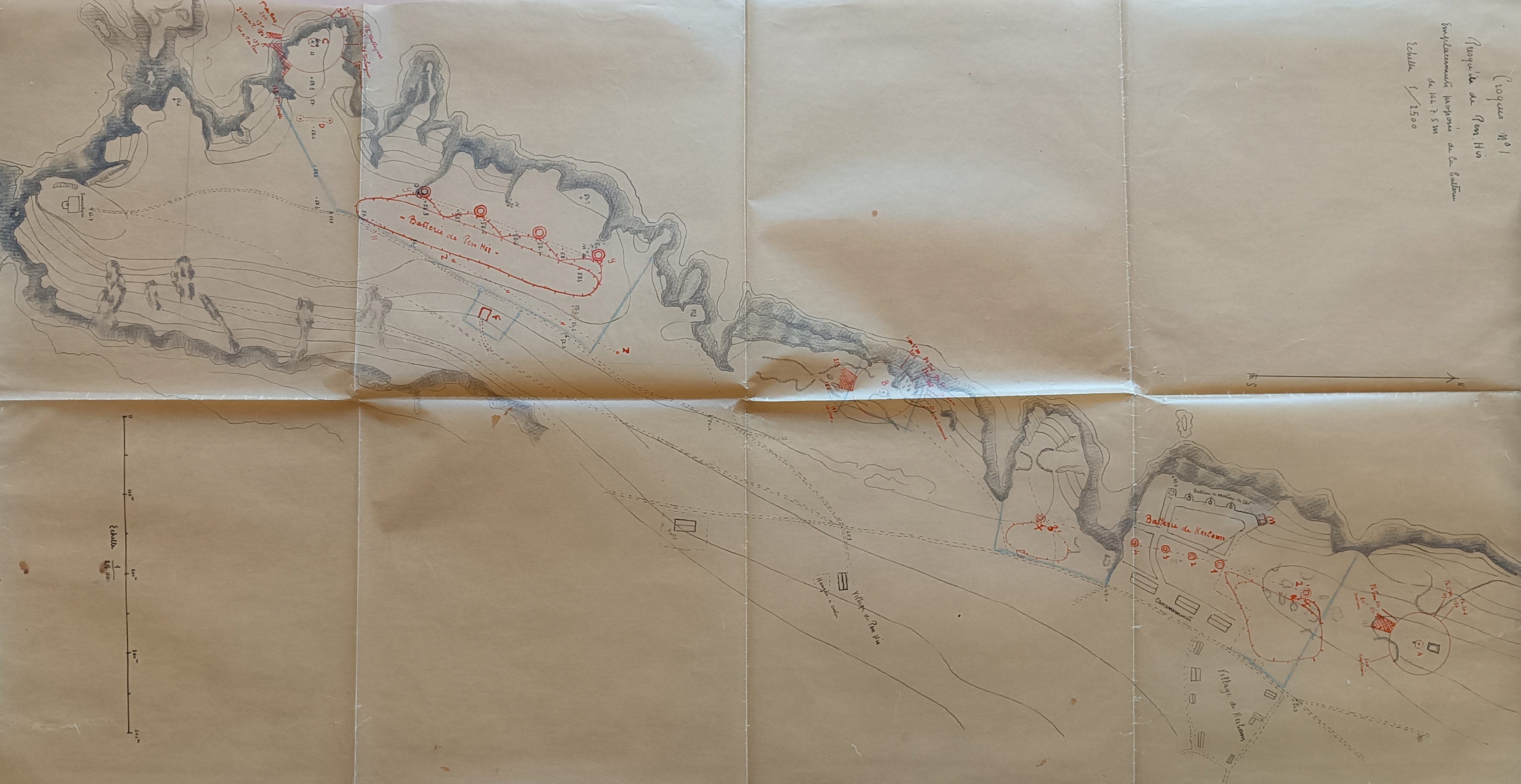 Plan de la pointe de Pen Hir à Camaret : représentation schématique des emplacements proposés pour la batterie de canon de 164 mm, 1926. Les emplacements sont figurés par des cercles rougesImmatriculation