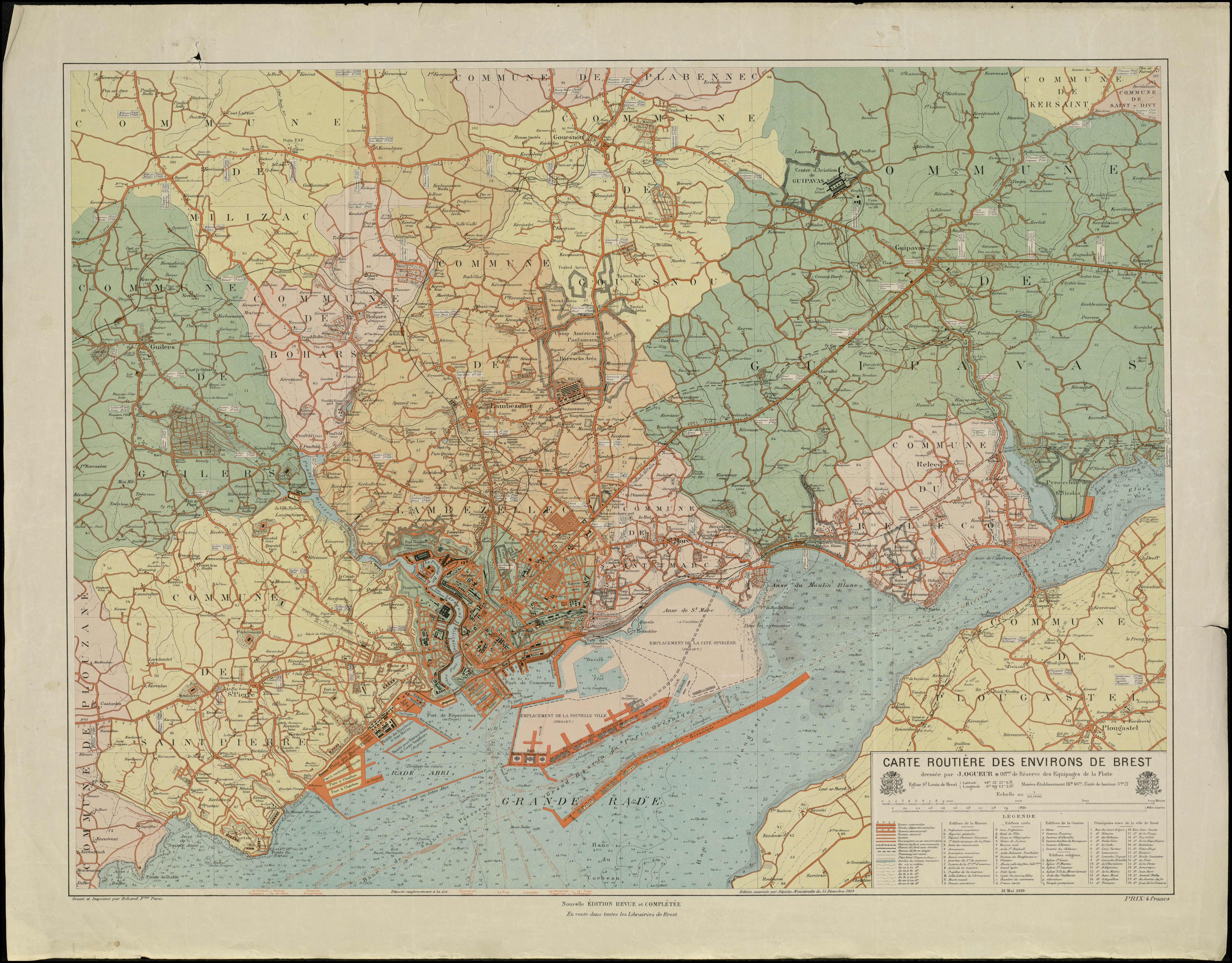 Carte routière de Brest et ses environs, J. Ogueur, 1919 : projection des différents projets de développement urbainImmatriculation