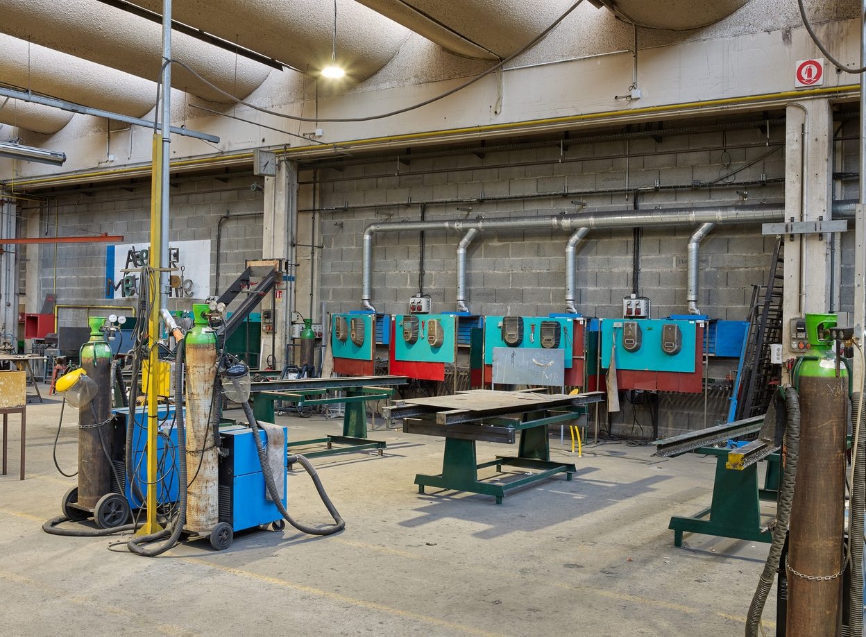 Vue intérieure des ateliers : soudure.Immatriculation