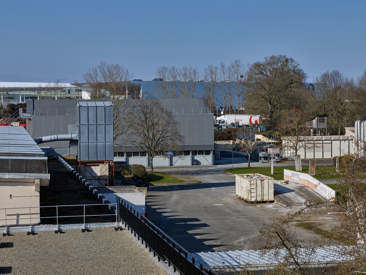 Façade sud des ateliers pédagogiques (bâtiment N), prise du toit des grands ateliers.Immatriculation