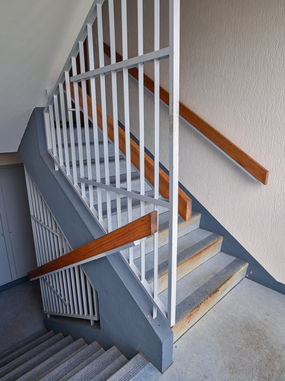Cage d'escalier du 'bloc' sud des logements de fonction. Roger Besnard, architecte, 1973-1974.Immatriculation
