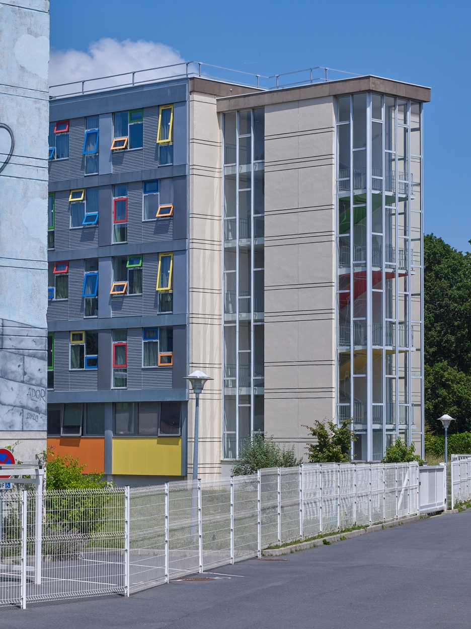 Angle sud-ouest de l'internat de filles. Louis Arretche et Jean Lemercier, architectes, 1967, réhabilitation Isabelle Hiault et Maryvonne Rigourd, architectes,Immatriculation