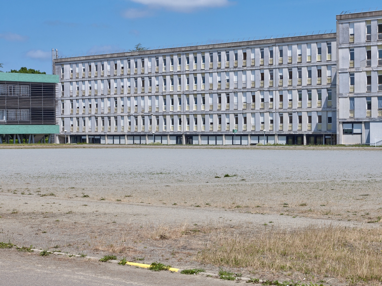 Vue partielle de la façade sud de l'espace sciences (bâtiments B2 et B3 ; Thierry Soquet, architecte, 2015) et vue d'ensemble de la façade ouest de 'l'aile' nord de l'internat de garçons (Louis Arretche et Jean Lemercier, architectes, 1967).Immatriculation