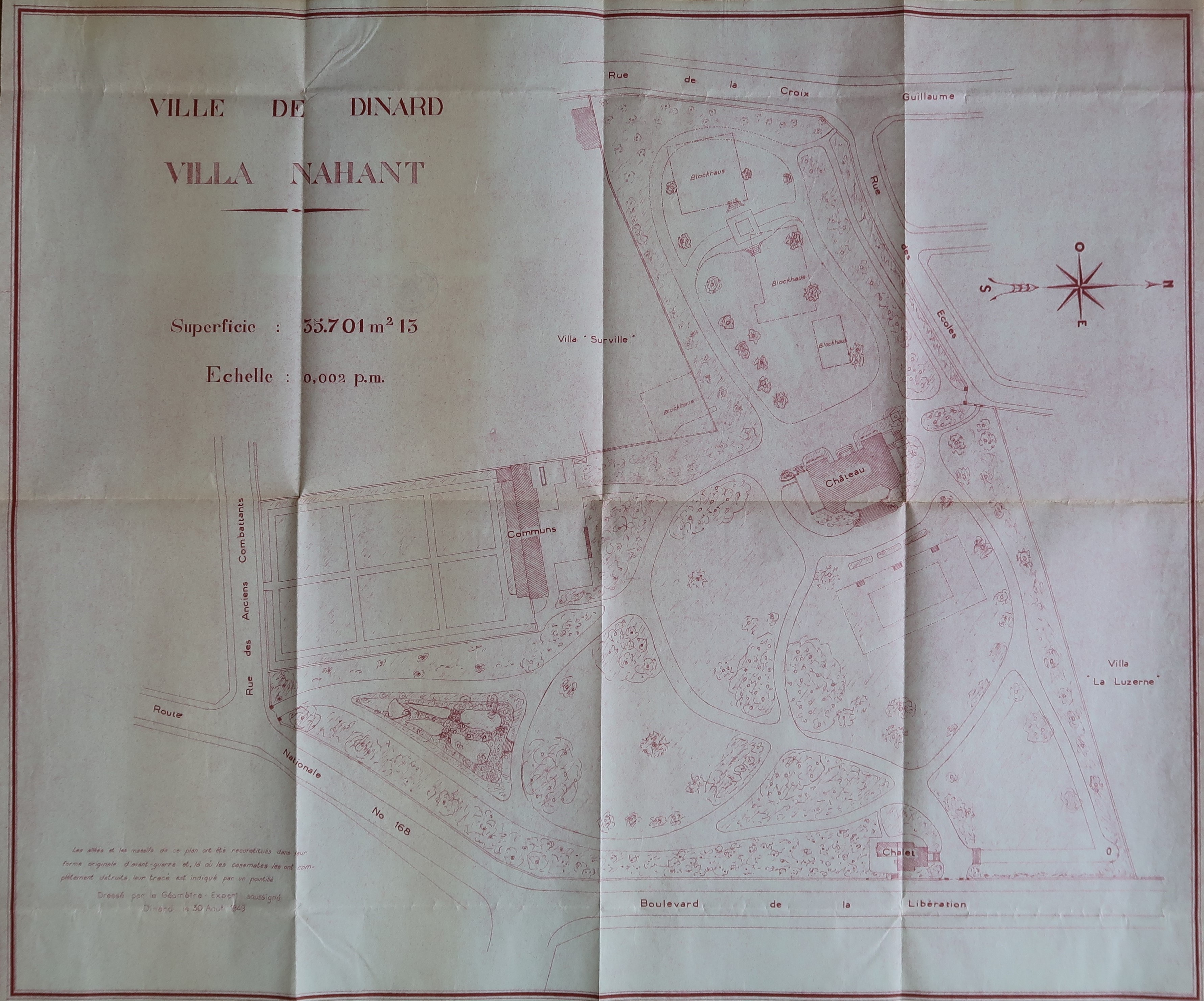 Ville de Dinard. Villa Nahant. Relevé de géomètre, 30 août 1949. Ce plan fait apparaître les emplacements de la villa, des blockhaus, le boisement du parc...Immatriculation