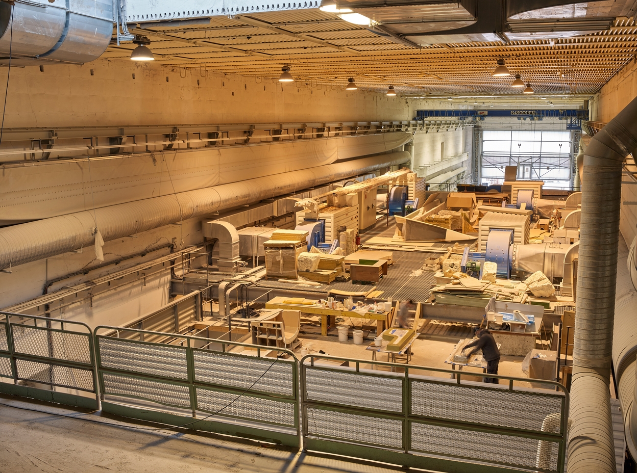 Vue générale de la nef n° 3 depuis le troisième étage des ateliers. La nef abrite le chantier naval Marsaudon Composites. Au fond, la porte translucide.Immatriculation
