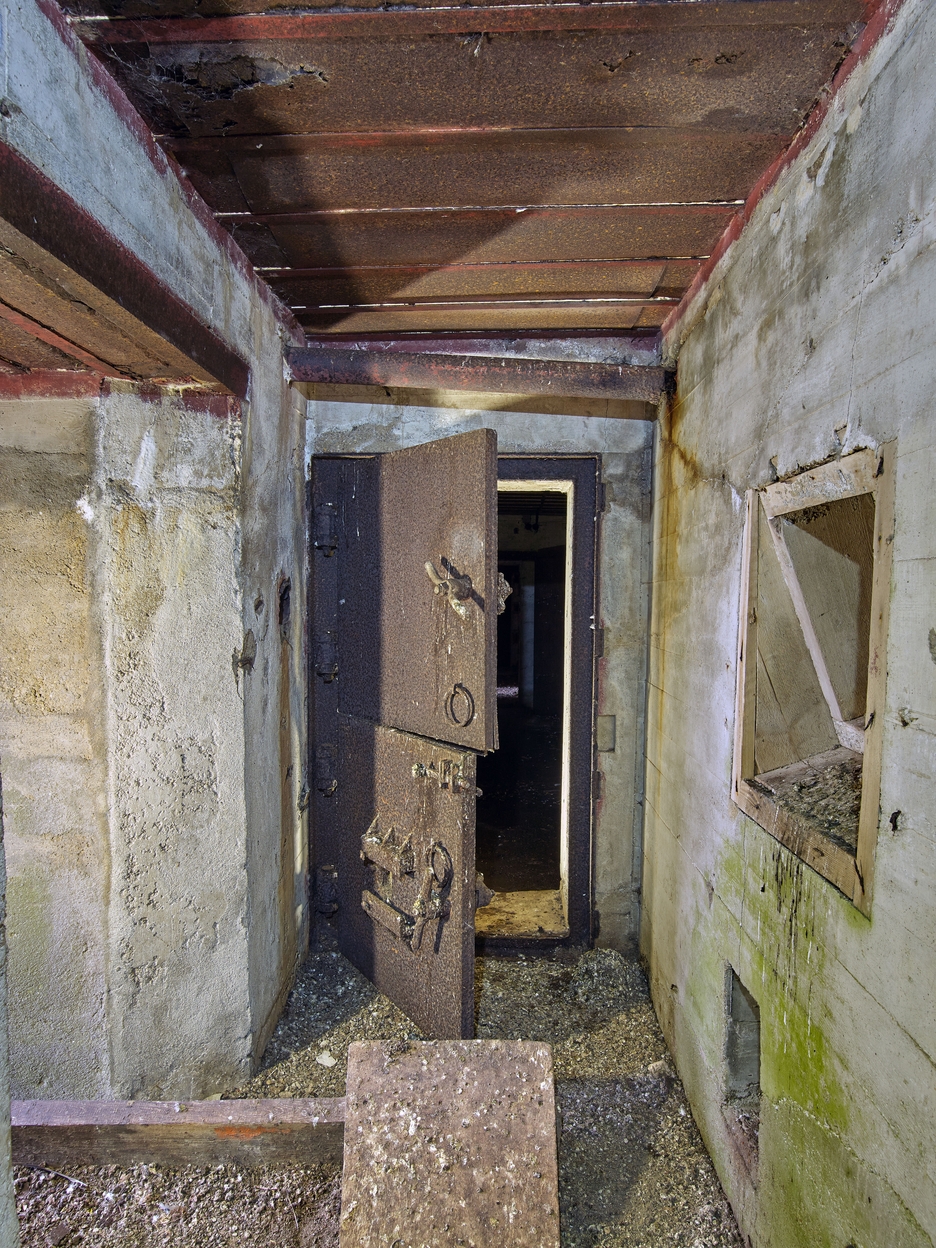 Vue du bunker du double encuvement antiaérien situé sur la dalle de couverture : porte blindée à deux vantaux du sas. A gauche : couloir d'entrée ; à droite : créneau de défenseImmatriculation