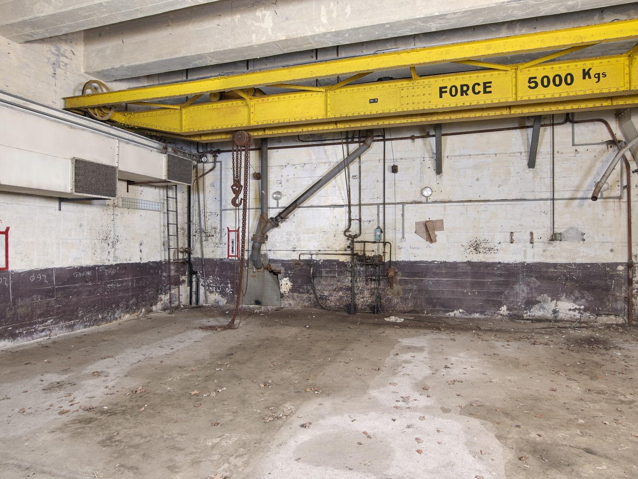 Locaux techniques, partie nord, rez-de-chaussée, grande pièce de la centrale électrique : pont roulant manuel d'une capacité de 5 tonnes et son treuil. Sur les murs bicolores, sont fixés des systèmes de tuyauterie et des gaines de ventilationImmatriculation