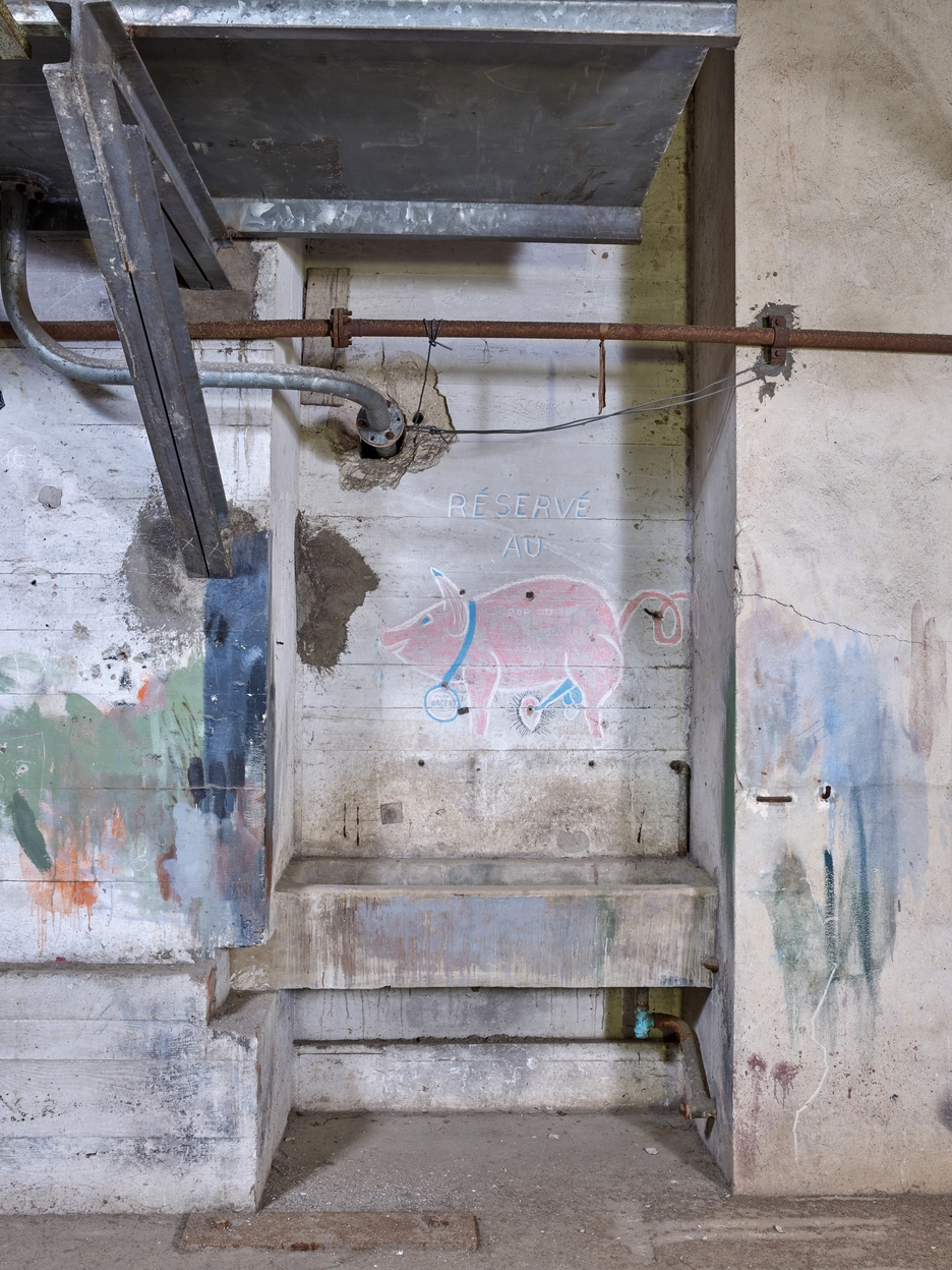 Locaux techniques, partie sud, premier étage, grande pièce : lavabo implanté dans une niche du mur de refend (sous le grand réservoir métallique). On peut lire : Réservé au [dessin d'un porc en érection avec une médaille]Immatriculation
