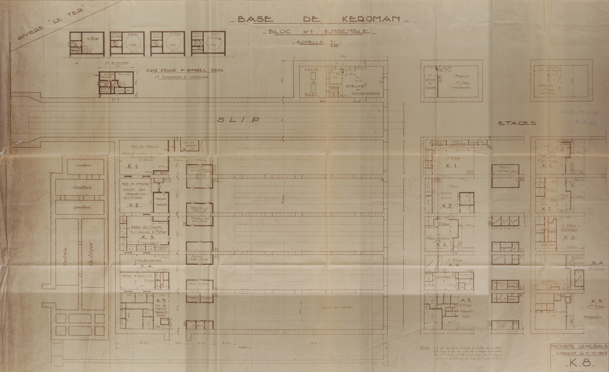 Plan d'ensemble du bunker "KI", plan K n° 8, 10 novembre 1945 (Service Historique de la Défense de Lorient, Monographie de la base "Ingénieur Général Stosskopf", 1945-1946)Immatriculation