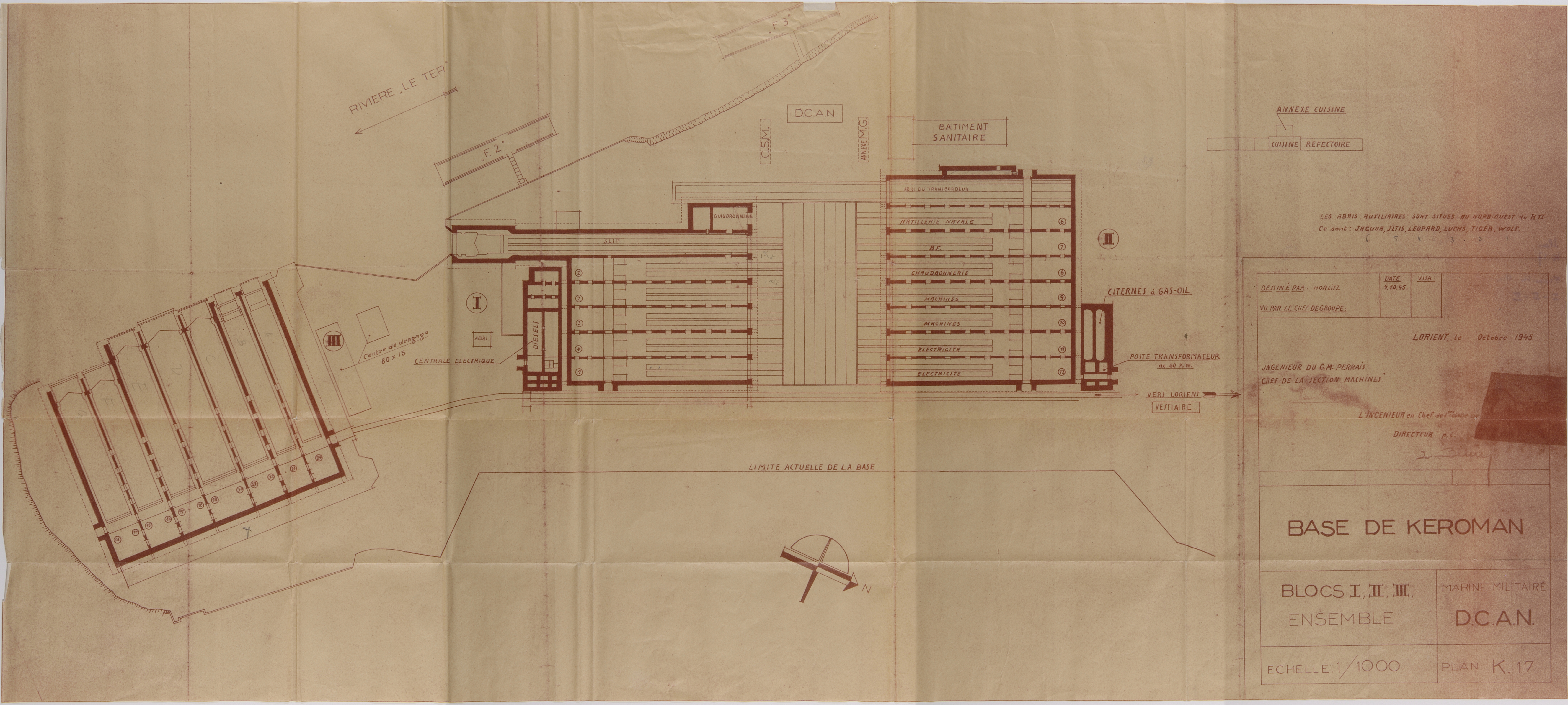Plan d'ensemble des bunkers "KI", "KII" et "KIII", plan K n° 17, 4 octobre 1945 (Service Historique de la Défense de Lorient, Monographie de la base "Ingénieur Général Stosskopf", 1945-1946)Immatriculation