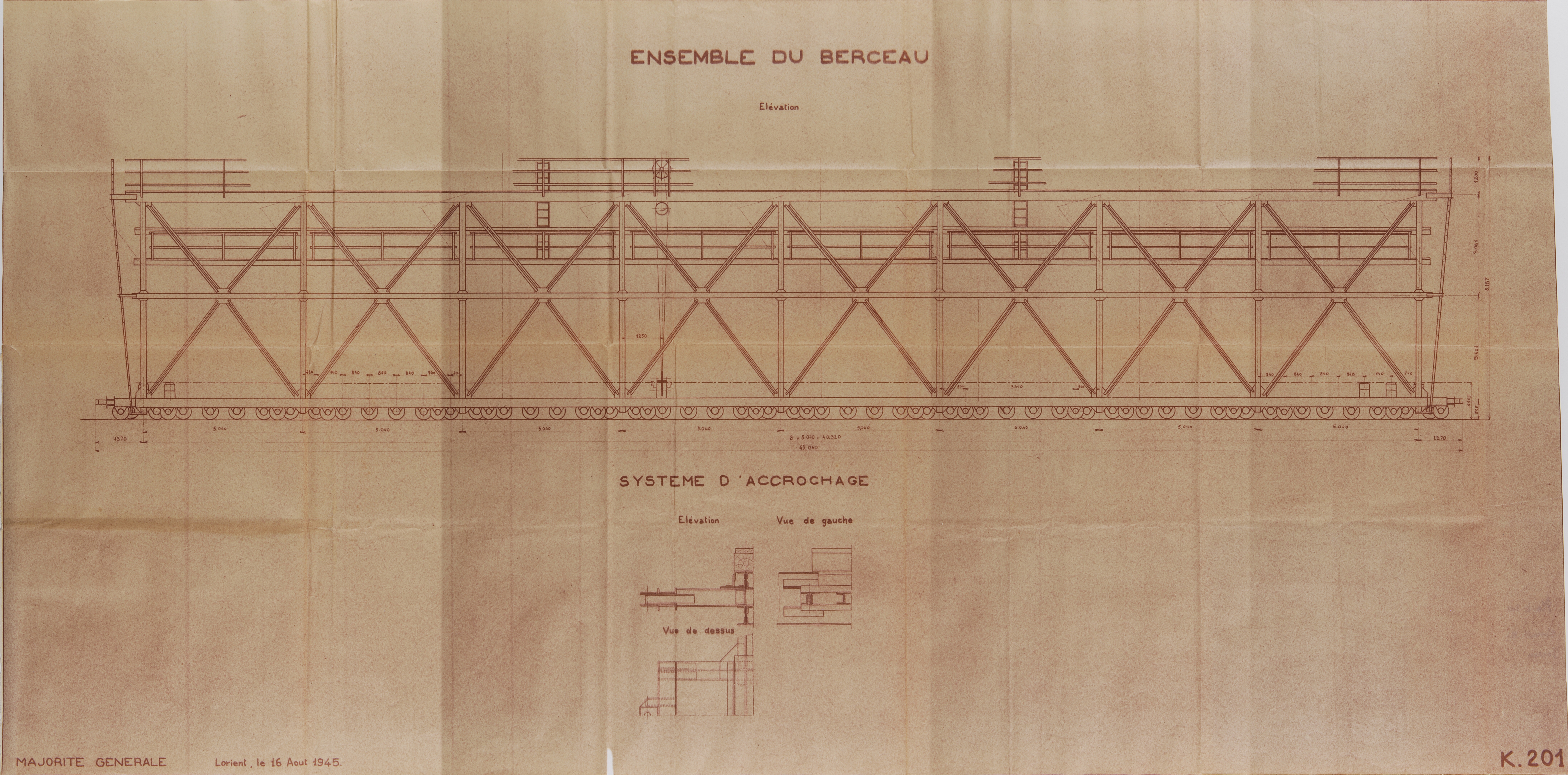 Elévation du berceau du slipway avec son système d'accrochage, plan K n° 201, 16 août 1945 (Service Historique de la Défense de Lorient, Monographie de la base "Ingénieur Général Stosskopf", 1945-1946)Immatriculation