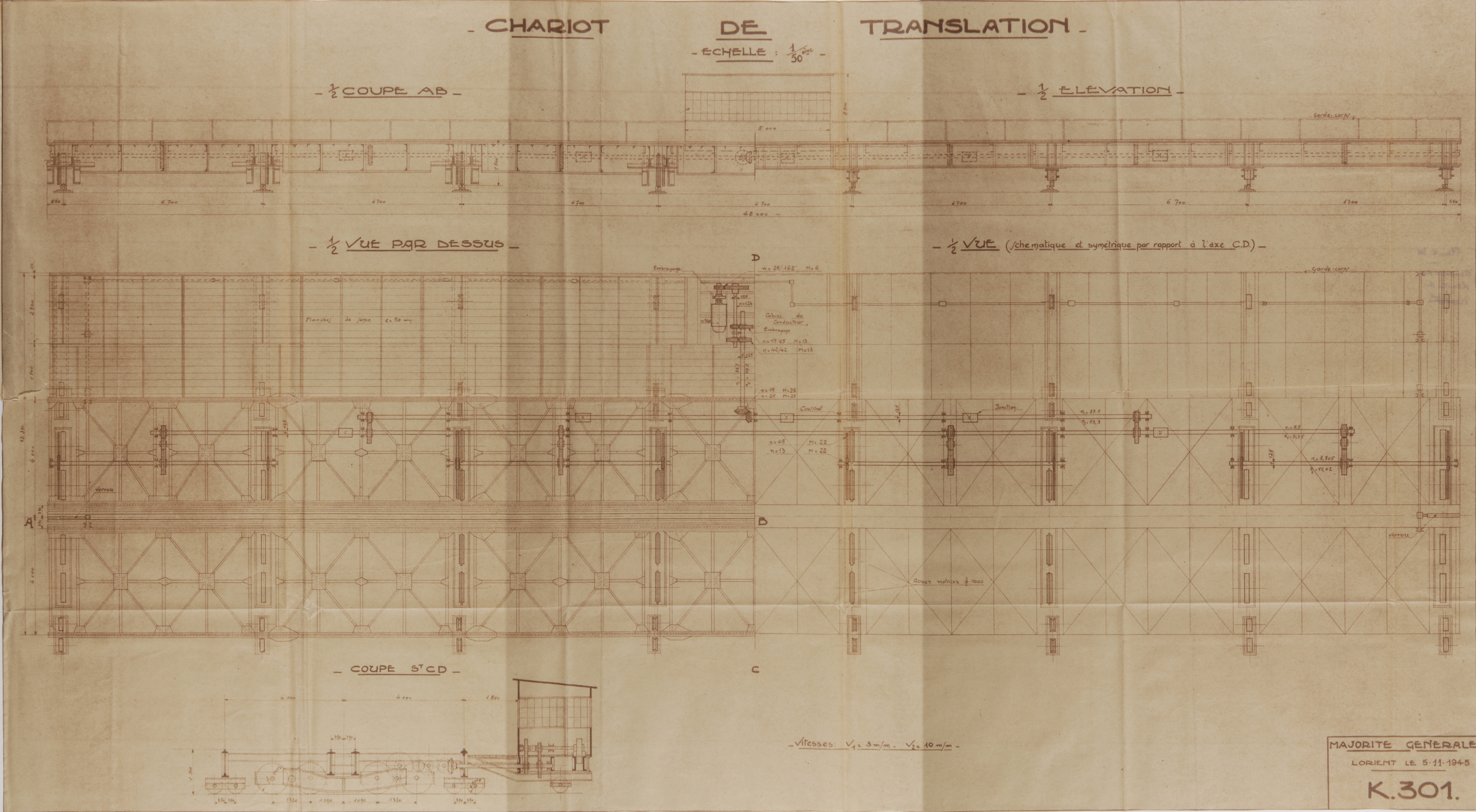 Coupes et élévations du chariot de translation, plan K n° 301, 5 novembre 1945 (Service Historique de la Défense de Lorient, Monographie de la base "Ingénieur Général Stosskopf", 1945-1946)Immatriculation