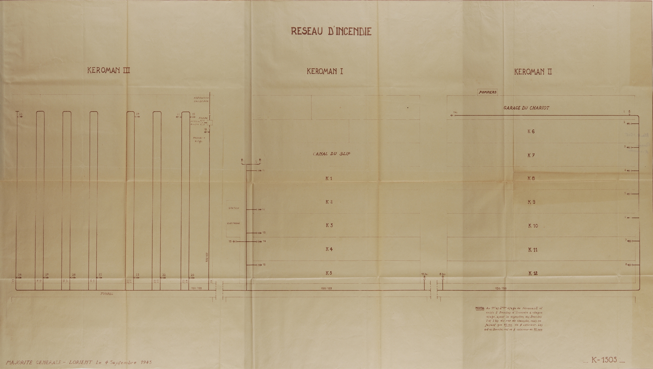 Schéma du réseau incendie de Keroman, plan K n° 1505, 4 septembre 1945 (Service Historique de la Défense de Lorient, Monographie de la base "Ingénieur Général Stosskopf", 1945-1946)Immatriculation