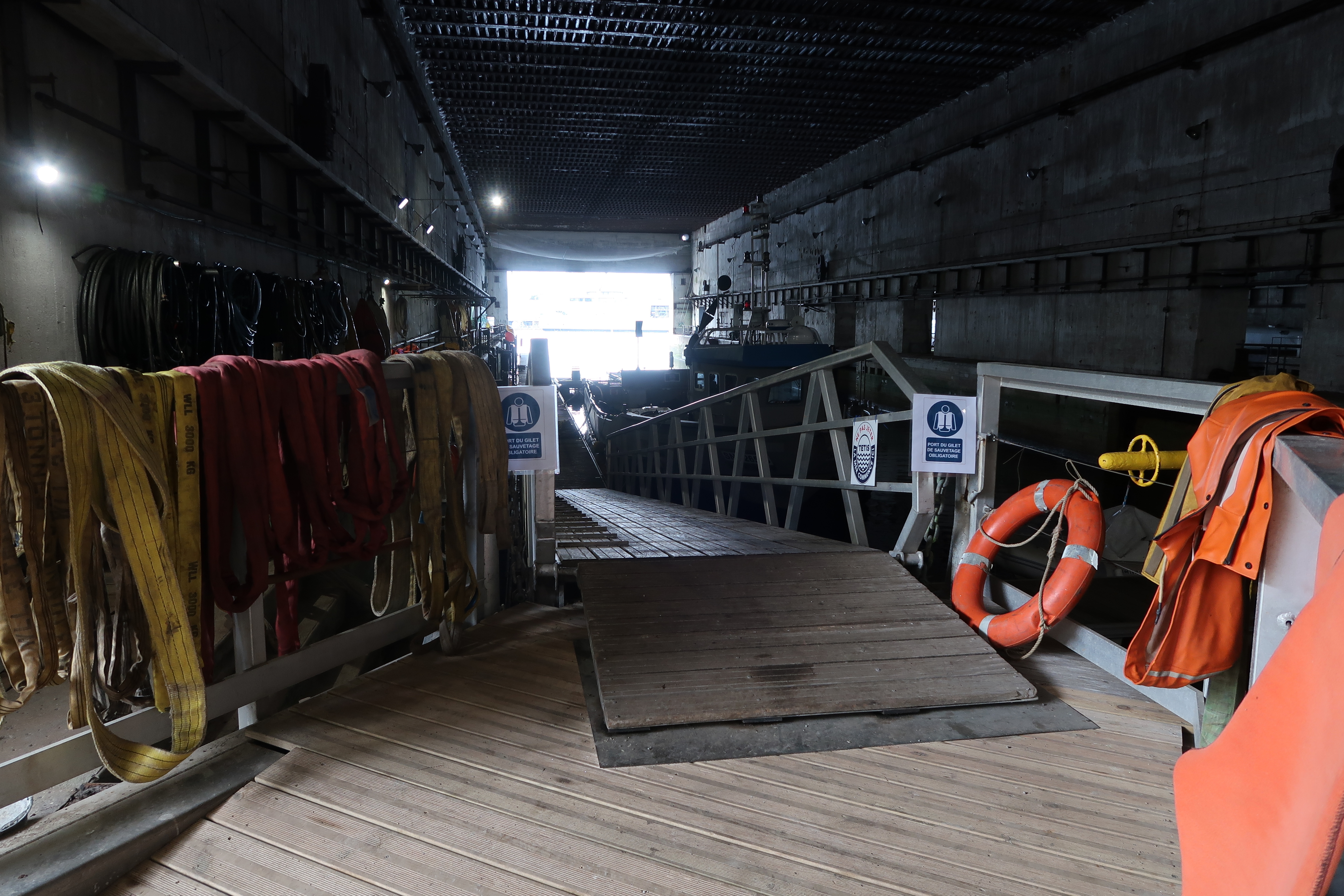 Vue de la passerelle d'accès au ponton flottant de l'alvéole sud (état en 2023)Immatriculation
