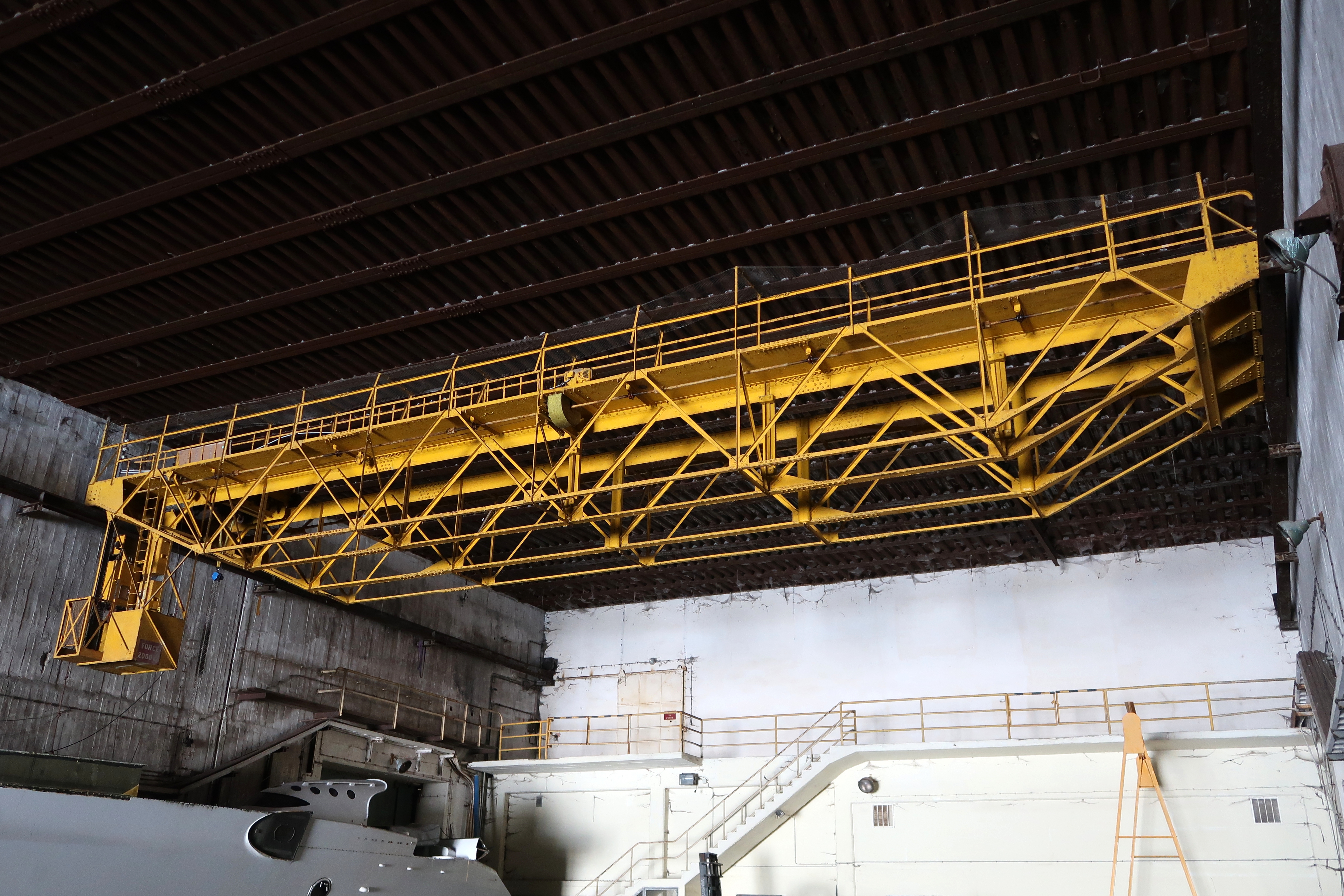 Vue générale du pont roulant Levman de l'alvéole nord depuis le quai central (état en 2023). Le pont roulant a été déplacé de quelques mètres vers l'ouest depuis 2019Immatriculation