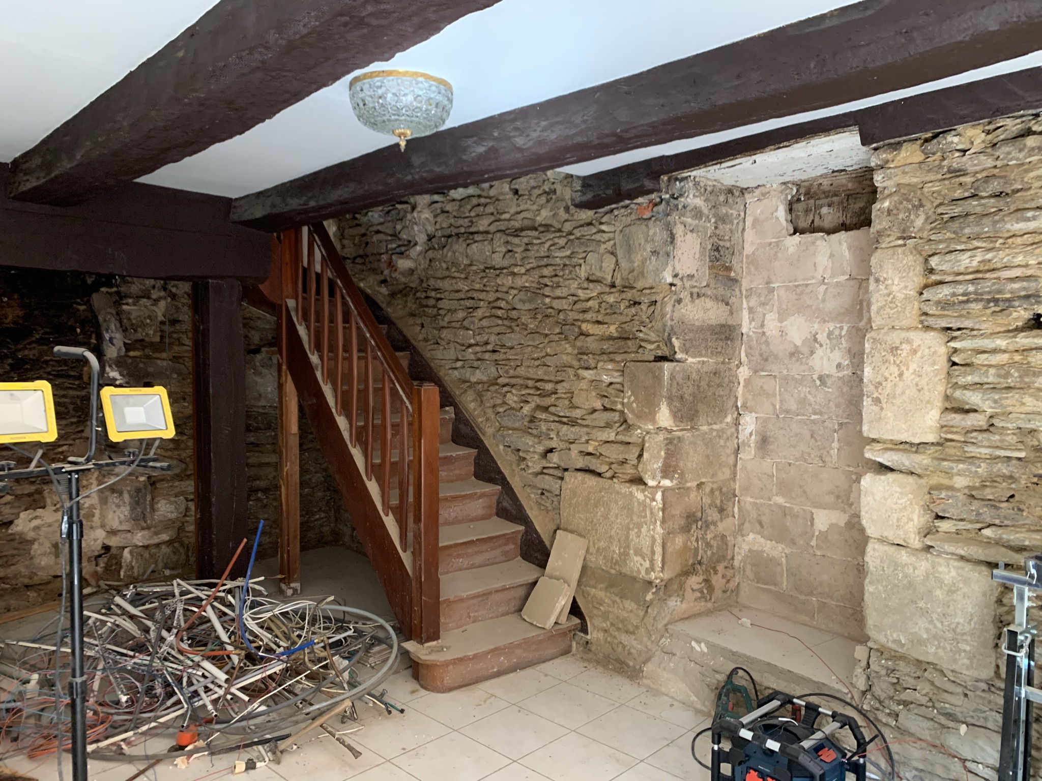 Escalier droit et ancienne porte dans le mur mitoyen d'avec le n°16.Immatriculation