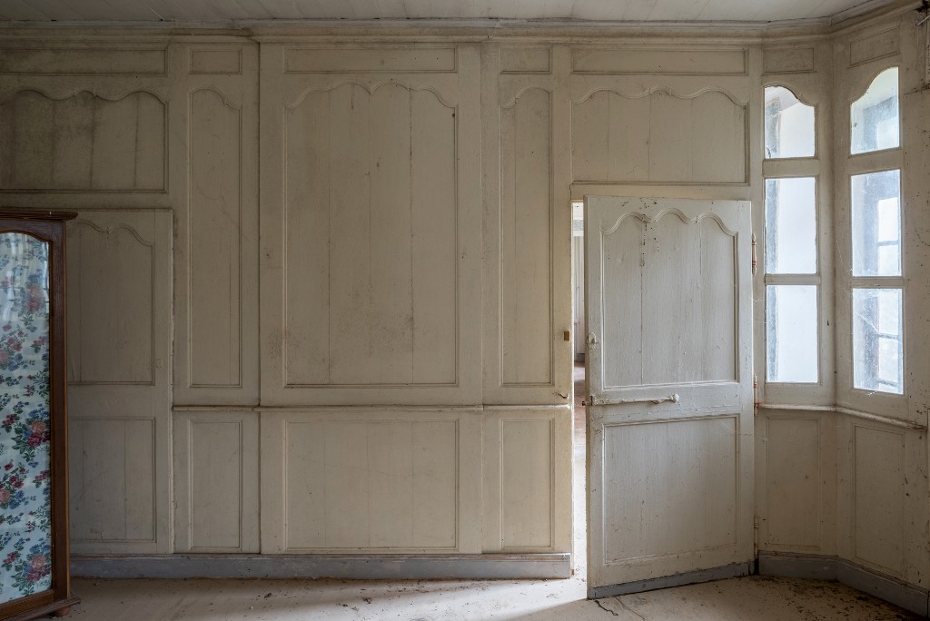 Logis 1758. Salle à manger. Cloison en menuiserie et ses panneaux vitrés en second jour donnant sur le vestibule d'entréeImmatriculation