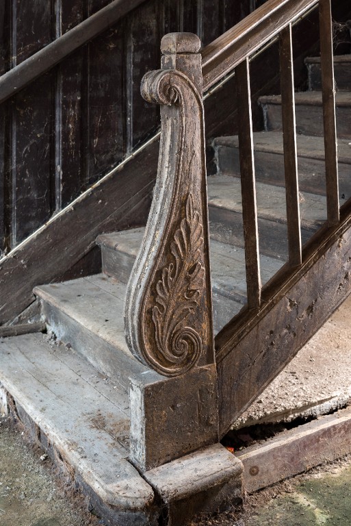Logis de 1713. Vestibule d'entrée. Escalier. Détail du départ de rampe orné d'une volute à feuillageImmatriculation