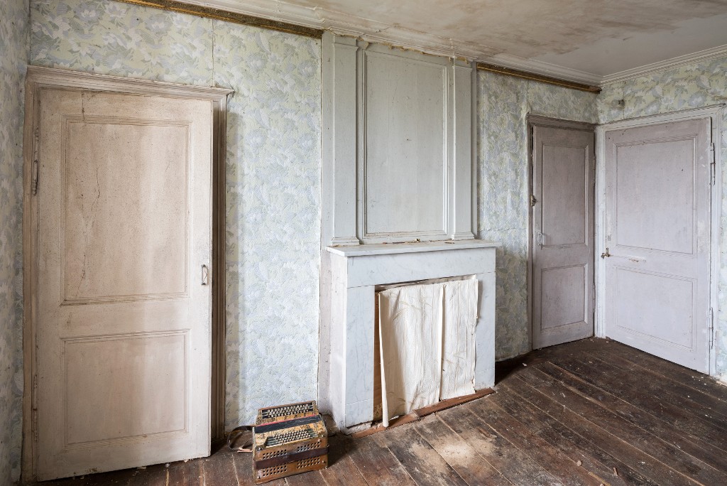 Logis 1758. Etage. Chambre à feu au-dessus de la salle à manger. Vue générale avec la cheminée et les placards murauxImmatriculation