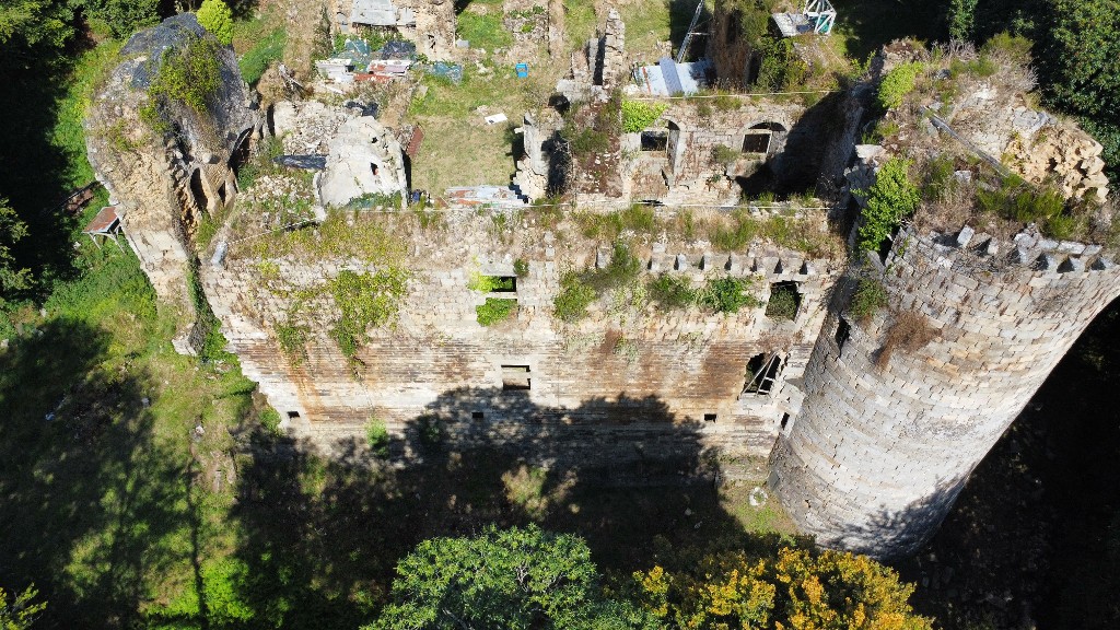 Vue aérienne oblique depuis le sud-sud-est : corps de bâtiment sud-est du grand corps de logis adossé à la courtine et tour orientale. Le château est couronné de consoles de mâchicoulisImmatriculation