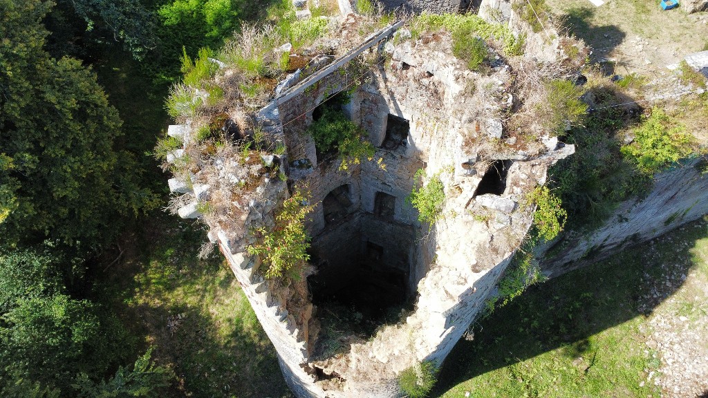 Vue aérienne oblique : tour orientale. Elle est couronnée de consoles de mâchicoulisImmatriculation