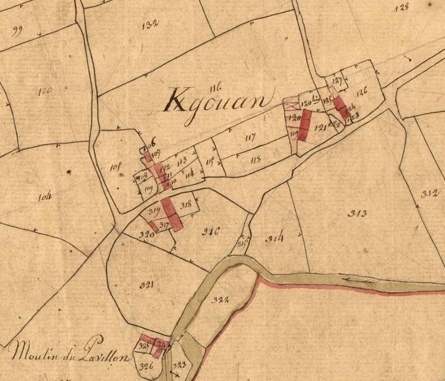Kergouhan en 1828. Extrait du cadastre ancien, section C1 (Archives départementales des Côtes-d'Armor, série 3 P 265)Immatriculation