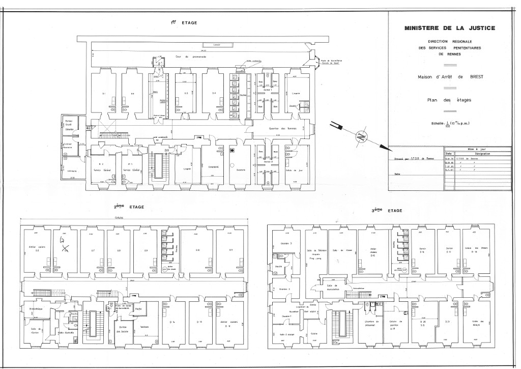 Plan de la maison d'arrêt de Brest, 12 janvier 1979 : étages (Ministère de la Justice, Direction régionale des services pénitentiaires de Rennes)Immatriculation