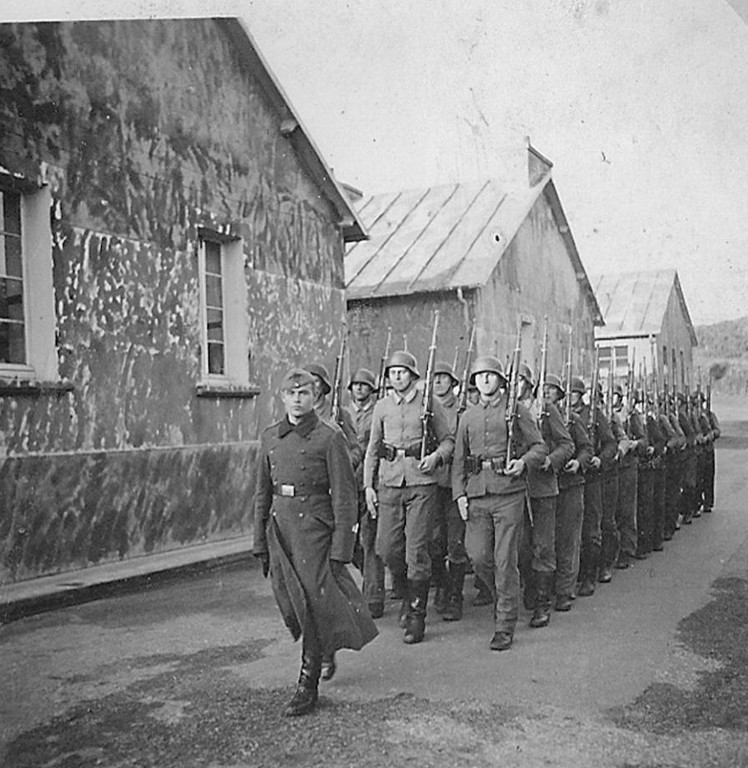 Vue d'un groupe de soldats allemands défilant dans le camp de Toulbroc'h durant la Seconde Guerre mondiale (collection particulière). A gauche, se trouvent une enfilade de trois casernements peints en camouflageImmatriculation