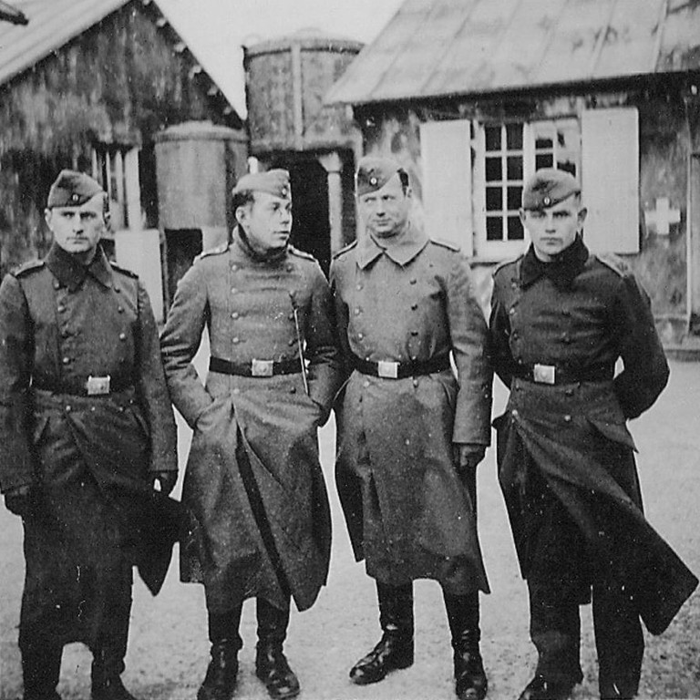 Vue d'un groupe de quatre soldats allemands dans le camp de Toulbroc'h durant la Seconde Guerre mondiale (collection particulière). A l'arrière-plan, se trouvent deux casernements dont l'un servant d'infirmerie (croix blanche) et château d'eauImmatriculation