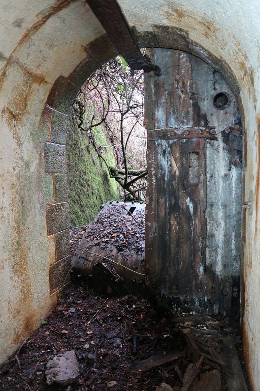 Vue de l'entrée depuis l'intérieur : battant de porte en bois doublé à l'extérieur d'une plaque métallique. Suspendu au plafond, le rail pour la manutention des obus via le treuil manuel à tambourImmatriculation
