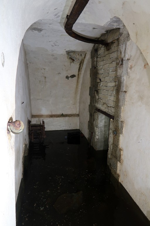 Vue du vestibule côté escalier : suspendu au plafond, le rail permettait la manutention des obus via un treuil. Au fond, le treuil manuel à tambour. Le magasin est partiellement inondéImmatriculation