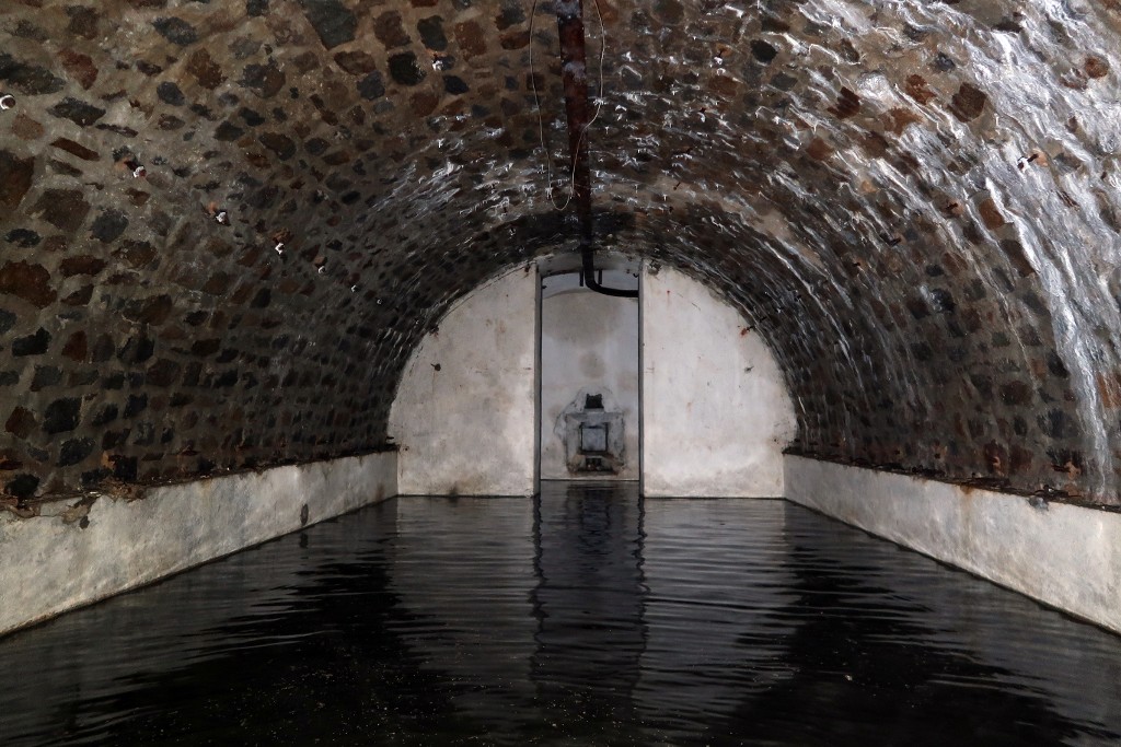 Vue du magasin voûté : au fond, le créneau à lampe. A l'origine, la maçonnerie est doublée par une couverture en tôle ondulée. Le magasin est partiellement inondéImmatriculation