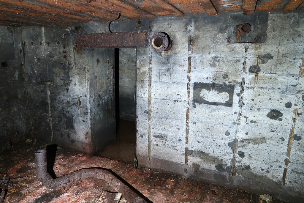 Vue de la salle de garde nord : accès de la petite salle et emplacement du ventilateur à droite. Les murs sont constellés déclats et noircis par la fumée. Le tuyau du système de ventilation gît au solImmatriculation