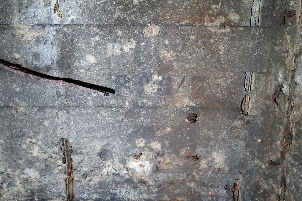 Vue intérieure du bunker - abri de type 502 pour deux groupes de combat (B 25/7) : angle nord-est, emplacement du boîtier de connexion téléphonique avec la numérotation B 25 / 7 du bunker. Les murs sont constellés d'éclats et noircis par la fumée (photographie réalisée après dépollution pyrotechnique)Immatriculation