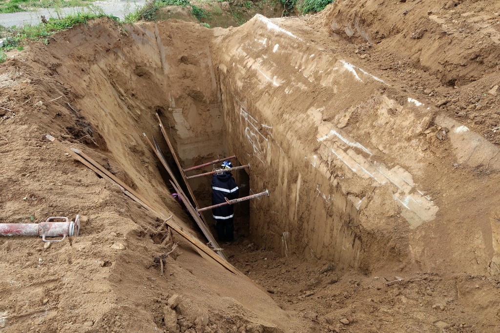 Vue de l'intervention du centre de déminage de Brest dans les deux bunkers du lotissement Alfred Nakache (mercredi 11 octobre 2023). L'accès au bunker sud a nécessité de creuser une importante tranchée à la pelle mécanique hydrauliqueImmatriculation