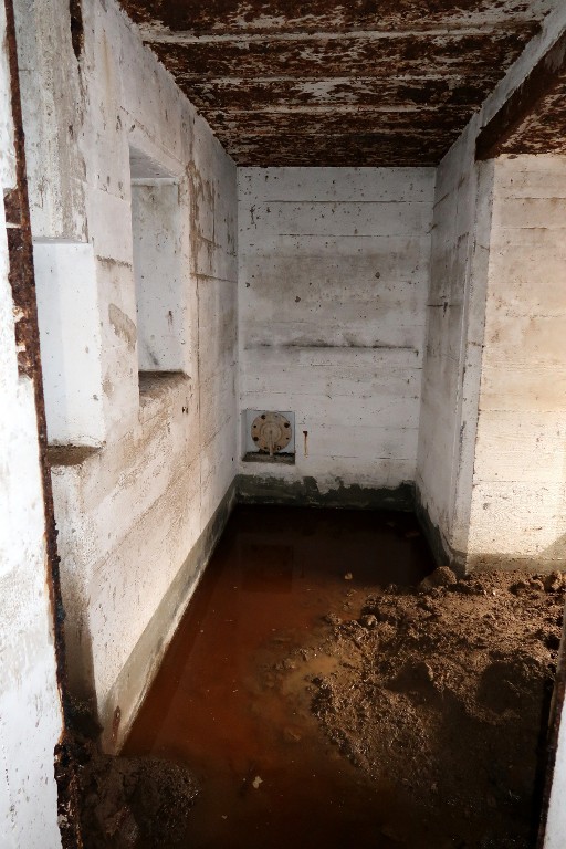 Vue de l'entrée nord : extrémité nord du couloir avec une bouche de surpression à clapet à contrepoids en aluminium. A gauche, emplacement d'un passage d'antenne et du créneau de tir défendant l'entréeImmatriculation