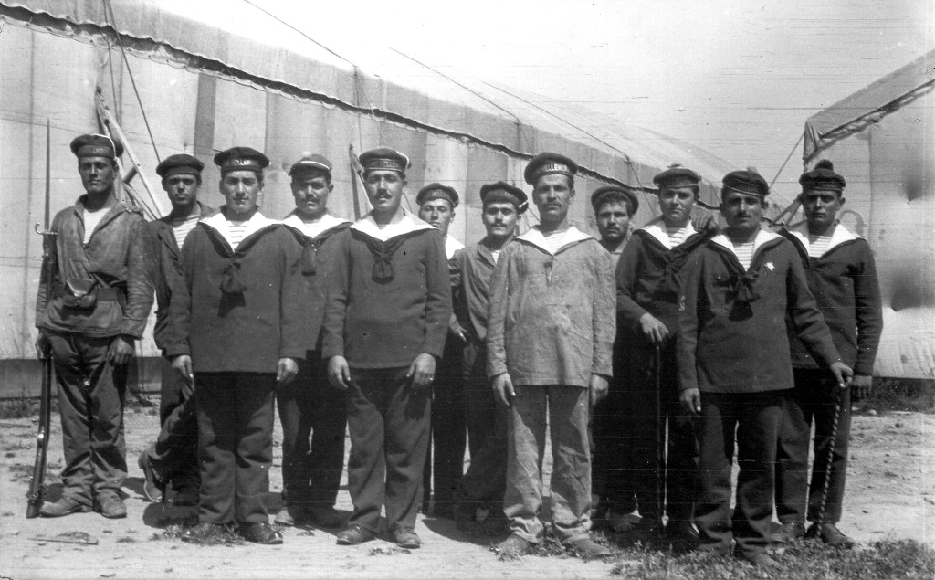 Marins Grecs posant devant un hangar Bessonneau (collection Daniel Dahiot - Archives départementales du Finistère, FRAD029_1NUM_007_61). Ils portent des uniformes français : seule la bande du bonnet indique leur appartenance à une Marine étrangèreImmatriculation