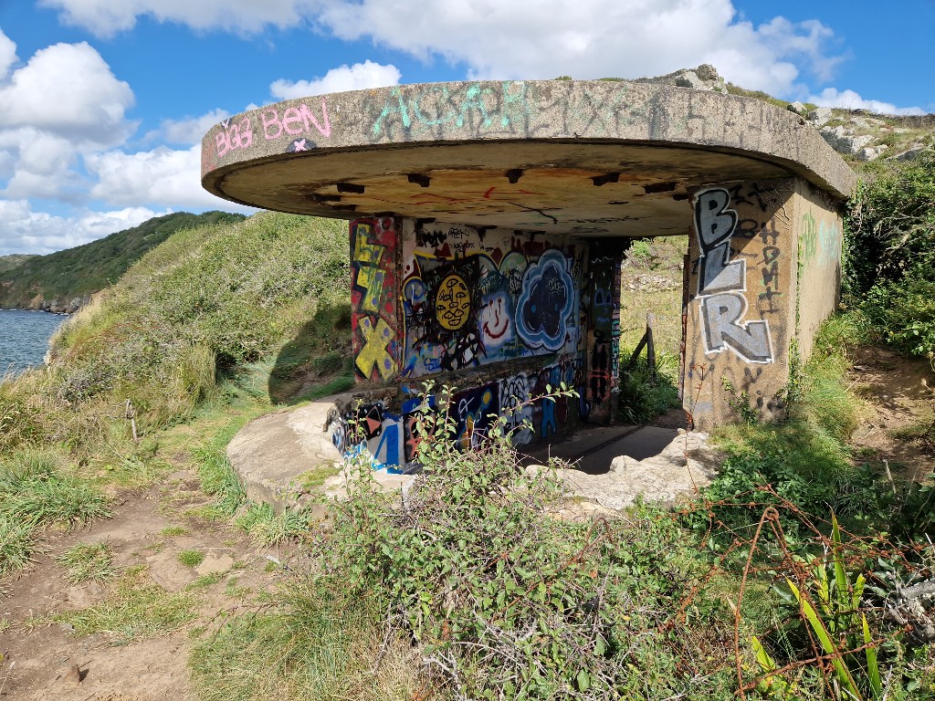 Vue du poste de combat pour projecteur après sécurisation (état en 2024). Au premier plan à droite, fil de fer barbelé se confondant avec la végétationImmatriculation