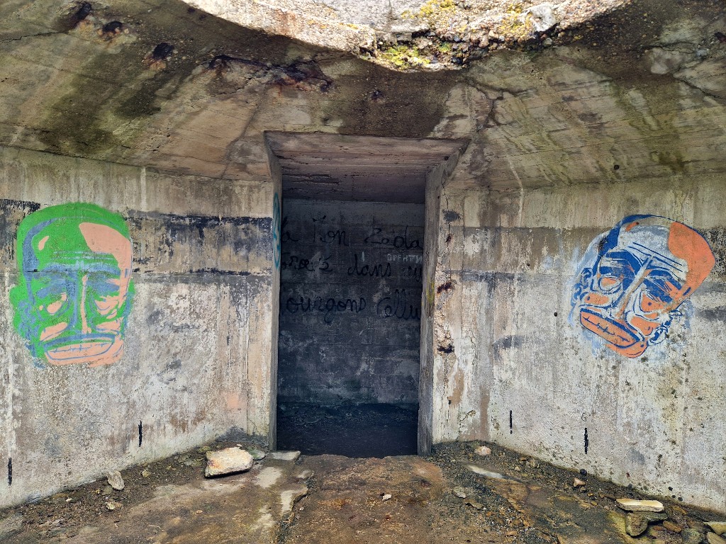 Vue intérieure : accès à l'escalier desservant le poste d'observation et de tir. Les murs sont taguésImmatriculation