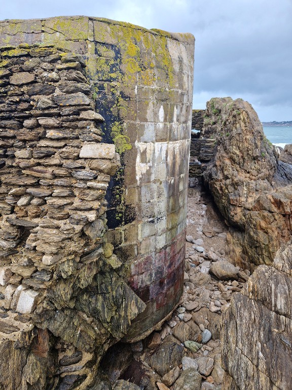 Vue de détail de l'angle nord-est. De ce côté de l'îlot, l'érosion marine a emporté le substrat. Le bunker est construit avec des parpaings dans lesquels a été coulé le béton ; il est recouvert d'une maçonnerie de moellonImmatriculation