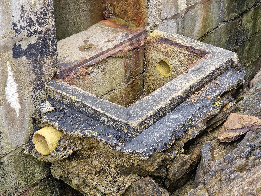 Vue du puisard subsistant devant l'entrée ouest de l'élévation nord. De ce côté, l'érosion marine a emporté le substrat de l'îlot : entrée et puisard sont dans le videImmatriculation