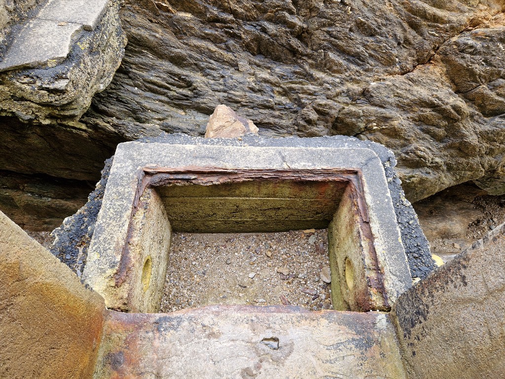 Vue du puisard subsistant devant l'entrée ouest de l'élévation nord. De ce côté, l'érosion marine a emporté le substrat de l'îlot : entrée et puisard sont dans le videImmatriculation