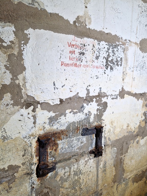 Vue intérieure : salle de garde est, emplacement du ventilateur et marquage en allemandImmatriculation