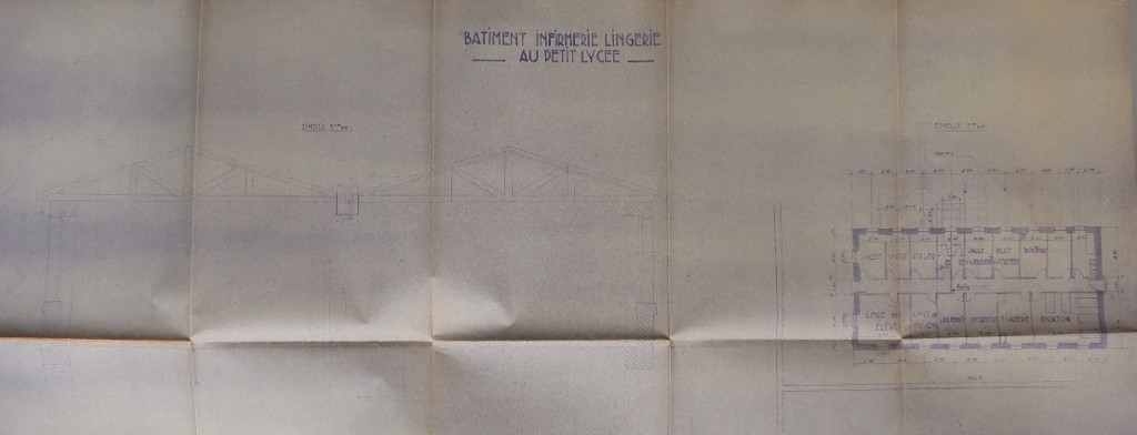 Coupe et plan de l'infirmerie-lingerie des garçons du "Petit Lycée". Sans nom ni date.Immatriculation