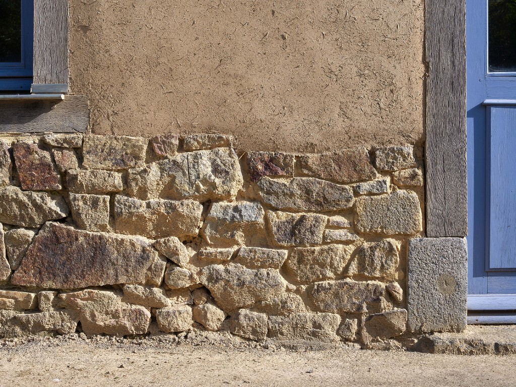 Elévation antérieure, détail du solin en pierre.Immatriculation