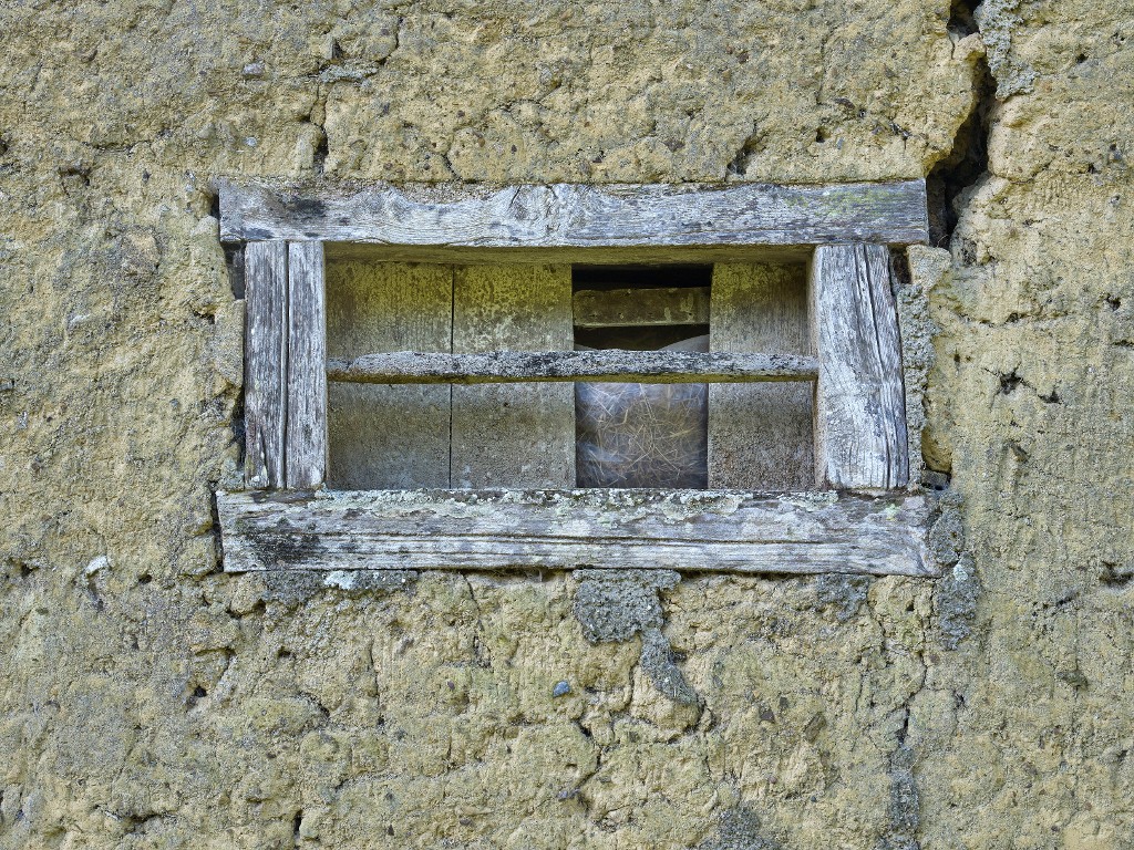 Elévation postérieure, détail d'une ouverture avec encadrement en bois.Immatriculation