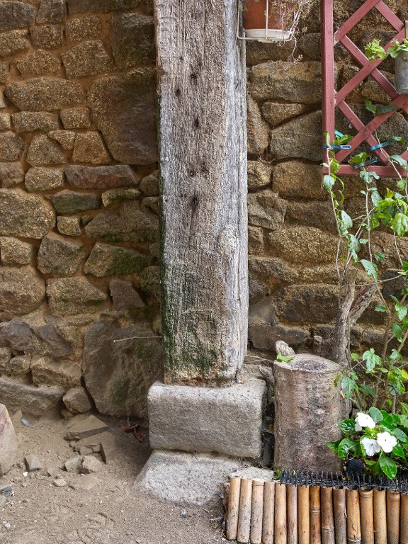 Détail du poteau reposant sur un dé de pierre pour bloquer les remontées d'humidité.Immatriculation
