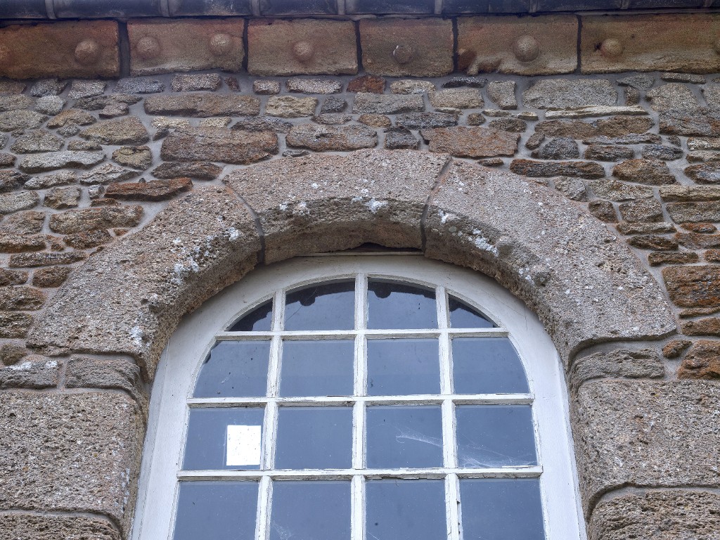 Façade est. Porte haute en pierre calcaire des Faluns. Détail du plein cintre et de la corniche ornés de boulesImmatriculation