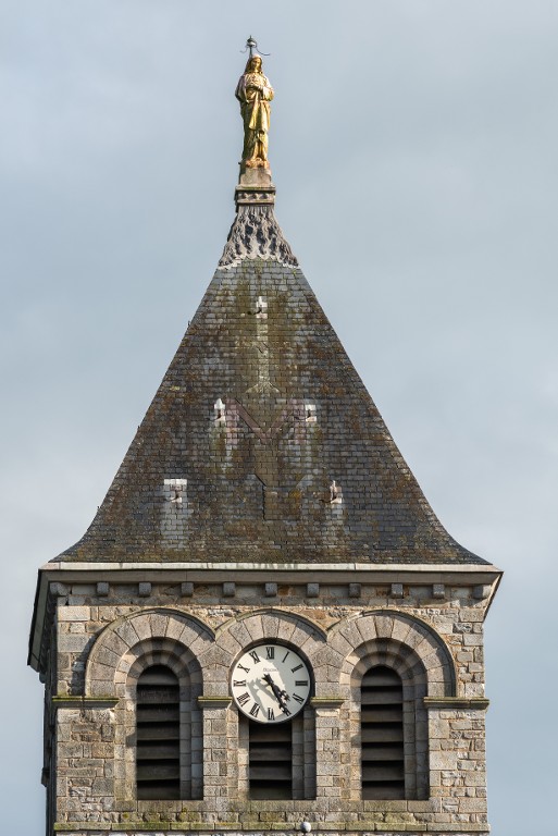 Sommet du clocher avec la statue de la Vierge doréeImmatriculation
