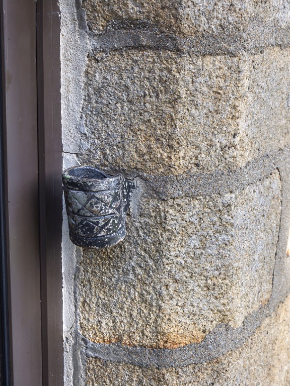 Façade sud. Porte d'entrée. Anneau de porte à husset gravé de motifs losangésImmatriculation